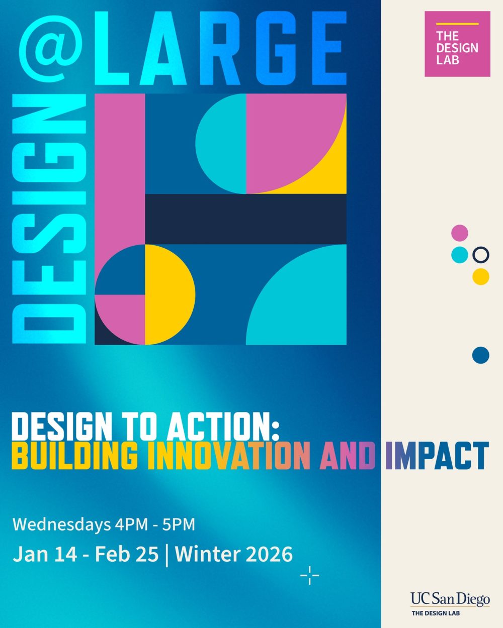 Design@Large: Design to Action is a six-part public series from the UC San Diego Design Lab exploring how design moves ideas into real-world impact. Through conversations and hands-on sessions, the series examines how teams set direction, build momentum, and sustain meaningful work across sectors. Each session highlights the practical decisions, relationships, and practices that help innovation take root and endure.